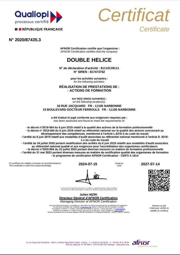 Pédagogie progressive. Le parcours intègre une progression pédagogique et alterne des visios et des entrainements (Exercice et cas pratique)